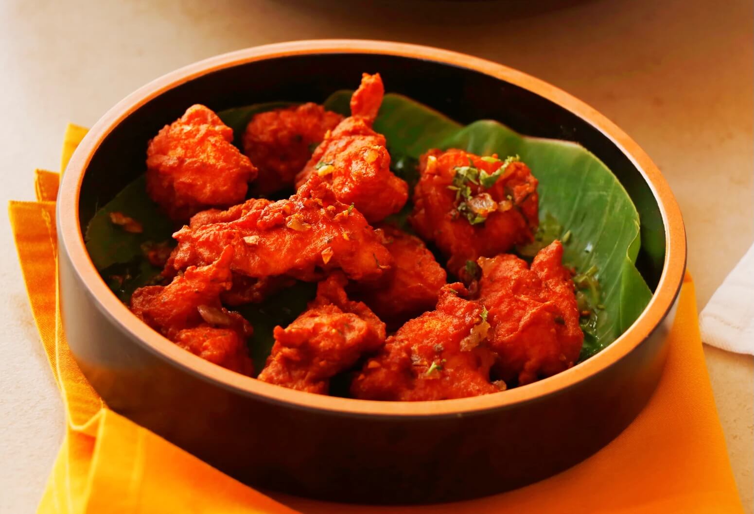 Gefrituurde bloemkoolroosjes gemarineerd in kruidenmengsel van chili-gember-knoflook.